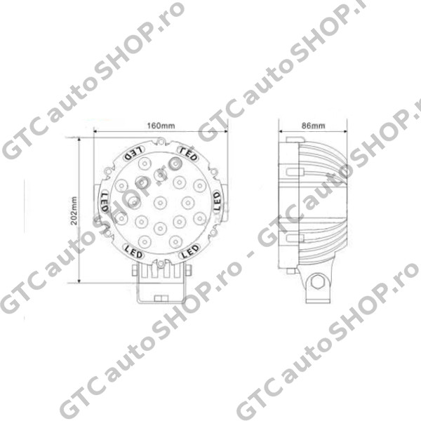 - Dimensiuni (diametru x adancime): 160 x 86 mm; inaltimea totala cu suport de prindere = 202 mm