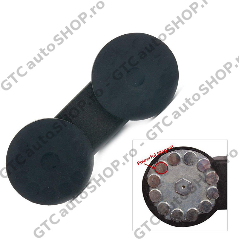 Suportul este fabricat din otel vopsit electrostatic iar baza magnetica este invelita in cauciuc pentru a proteja vopseaua masinii.