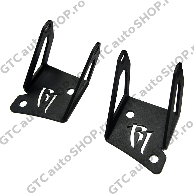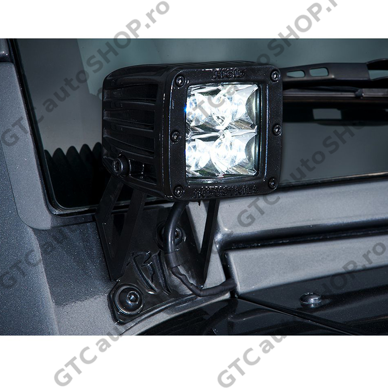 Compatibil cu proiectoarele D-Series, Radiance Pod, D-SS si Dually de la Rigid Industries, dar si alte proiectoare. Suporturile se monteaza pe stalpii laterali ai parbrizului in gaurile existente ale masinii, fara a gauri caroseria. Pe suport, proiectoarele se pot adjusta pe verticala astfel incat sa lumineze in directia dorita. Suporturile sunt fabricate din otel inoxidabil si vopsite in culoare neagra mata incat sa se potriveasca cu aspectul proiectoarelor.
