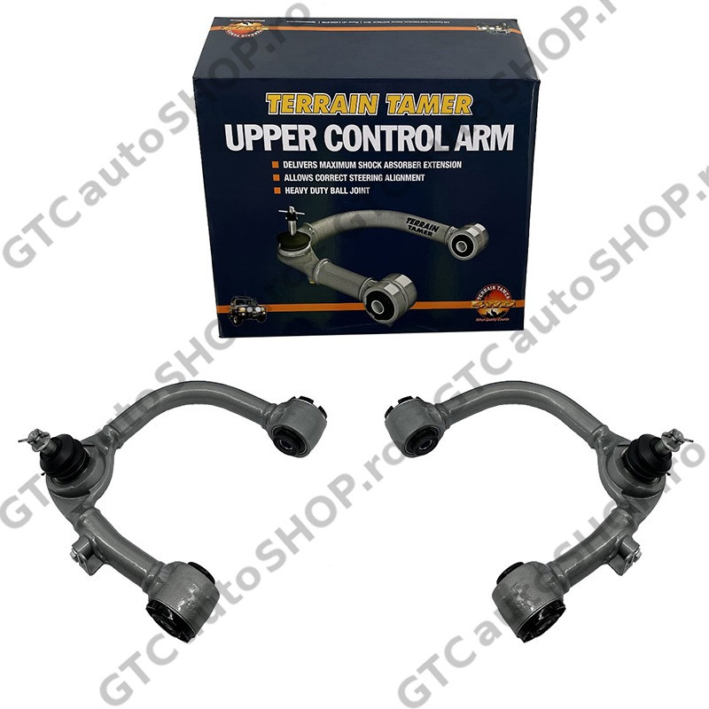 Set de 2 bascule superioare modificate, de la Terrain Tamer Australia, proiectate sa asigure pozitionarea corecta a rotilor si deschiderea optima a amortizoarelor la kiturile de suspensie cu inaltare de 4-5 cm.