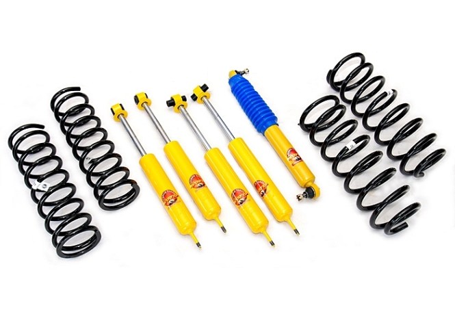 Kit suspensie premium Terrain Tamer Australia pentru Toyota Land Cruiser 70 si 73 cu arcuri elicoidale, fabricatie 1990 - 1997, ce asigura inaltarea masinii cu 4-5 cm (functie de incarcare si starea suspensiei vechi).