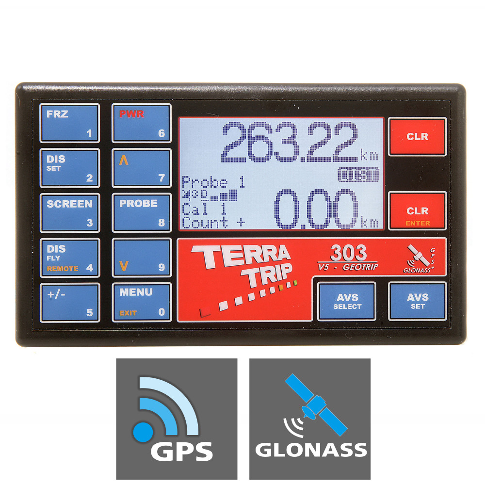Acest Terratrip este cel mai performant model de tripmeter ce se foloseste la raliuri si competitii off-road, avand o precizie de masurare excelenta datorita faptului ca se conecteaza la 48 de sateliti, prin intermediul sistemelor GPS si GLONASS; V5 ste mult mai precis decat telefoanele cu GPS sau aparatele de navigatie auto. Terratrip 303 Geotrip V5 se autocalibreaza si poate estima distanta parcursa atunci cand se pierde semnalul GPS (de exemplu la trecerea prin tunel); daca se monteaza un senzor, atunci V5 se comuta automat la senzor cand pierde semnalul GPS.